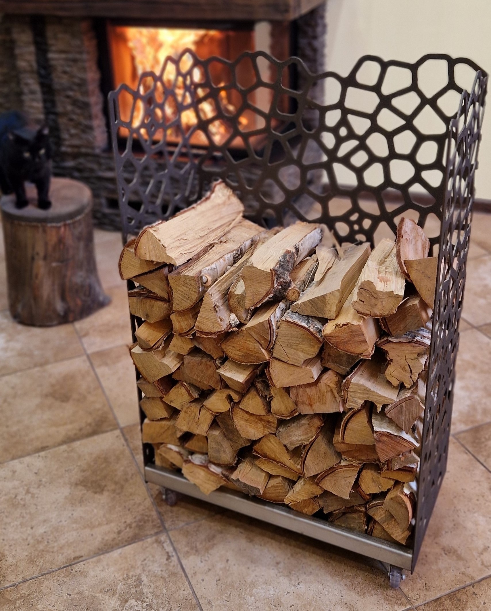 Дровница выполнена из конструкционной стали толщиной 3 мм, грузоподъемность — до 160 кг, вместимость — 200 литров. Дровница покрыта полимерно-порошковым покрытием муар, цвет антрацит.